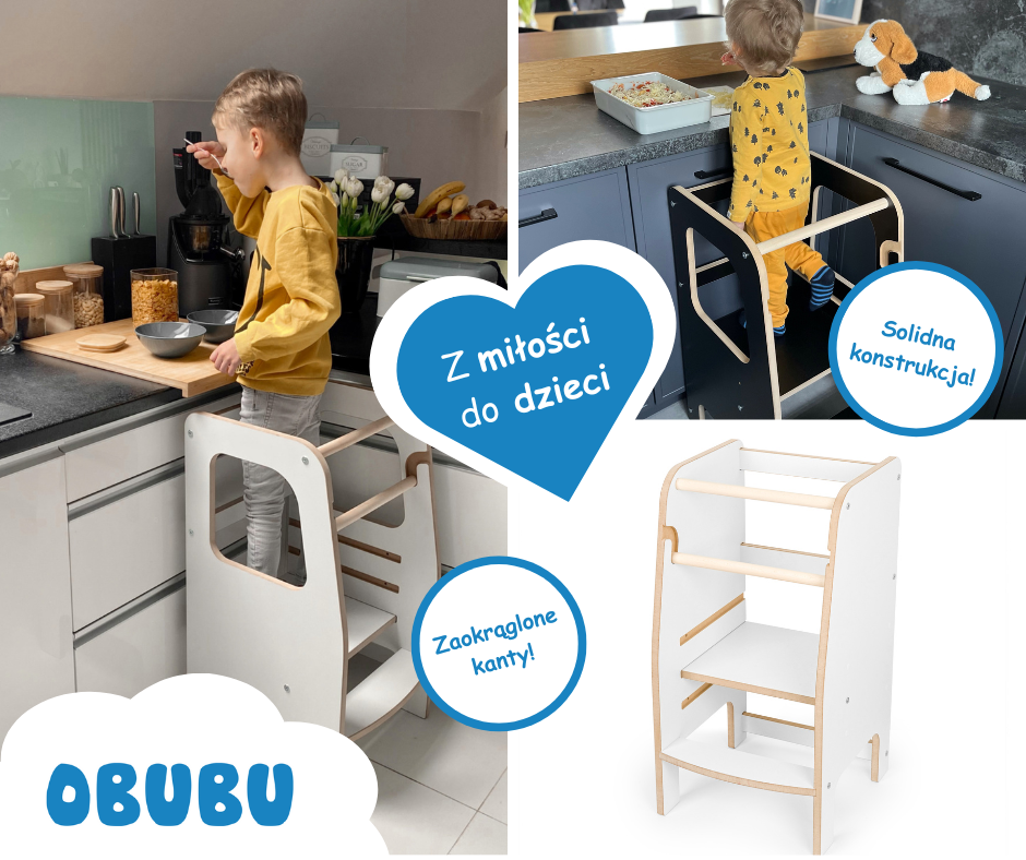 Pomocniki kuchenne z oferty OBUBU mają dodatkowe zabezpieczenie, zaokrąglone krawędzie, oraz trzy poziomy regulacji wysokości, które rosną razem z dzieckiem. Dzięki temu są idealne już od momentu, kiedy maluch stabilnie stoi – czyli najczęściej od ok. 12 miesiąca życia. Uwaga: pamiętaj, że produkty dla dzieci zawsze należy używać pod nadzorem osoby dorosłej.
