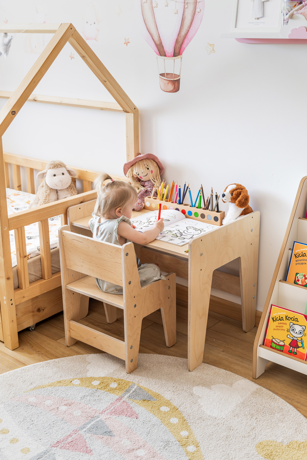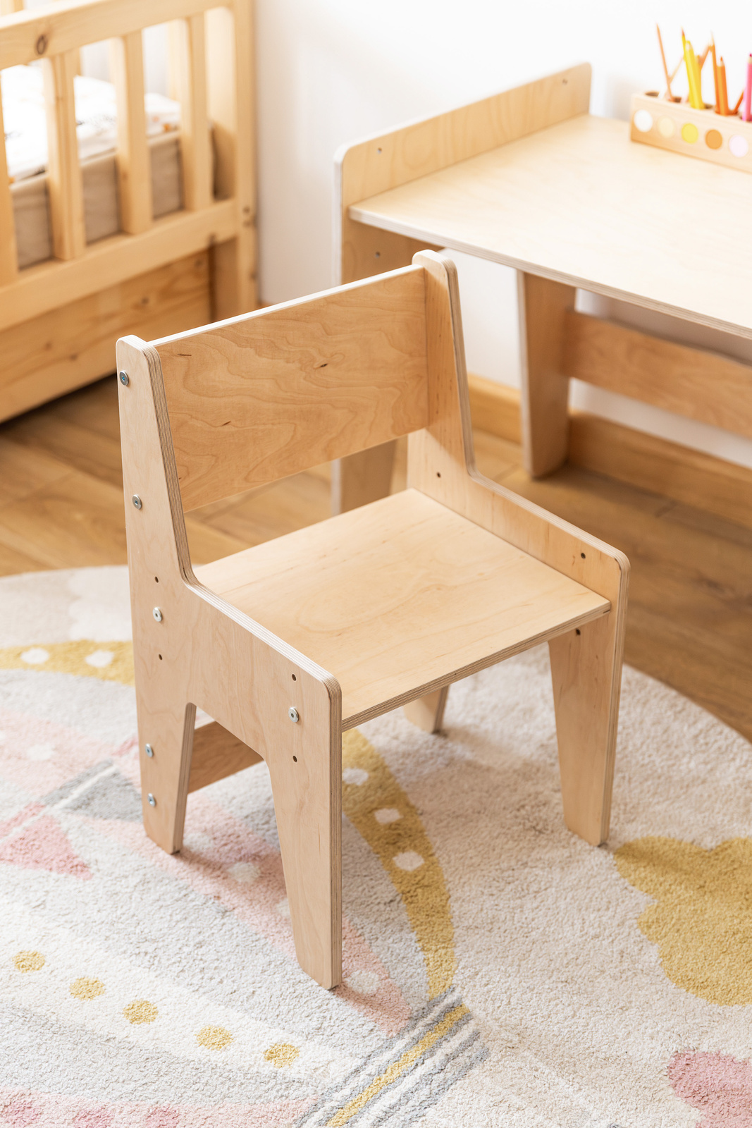Jest bardzo łatwe w montażu. Wykonane ze sklejki brzozowej pokrytej białym filmem melaminowym, odpornym na zarysowania, krawędzie zaokrąglone i przeszlifowane. Taki mebel w stylu Montessori idealnie sprawdzi się w dziecięcym pokoiku, w którym spędzi wiele lat, służąc maluchowi na różnych etapach rozwoju, zarówno do zabawy, jak i nauki. Krzesełko idealnie pasuje do naszego biurka rosnącego razem z dzieckiem.