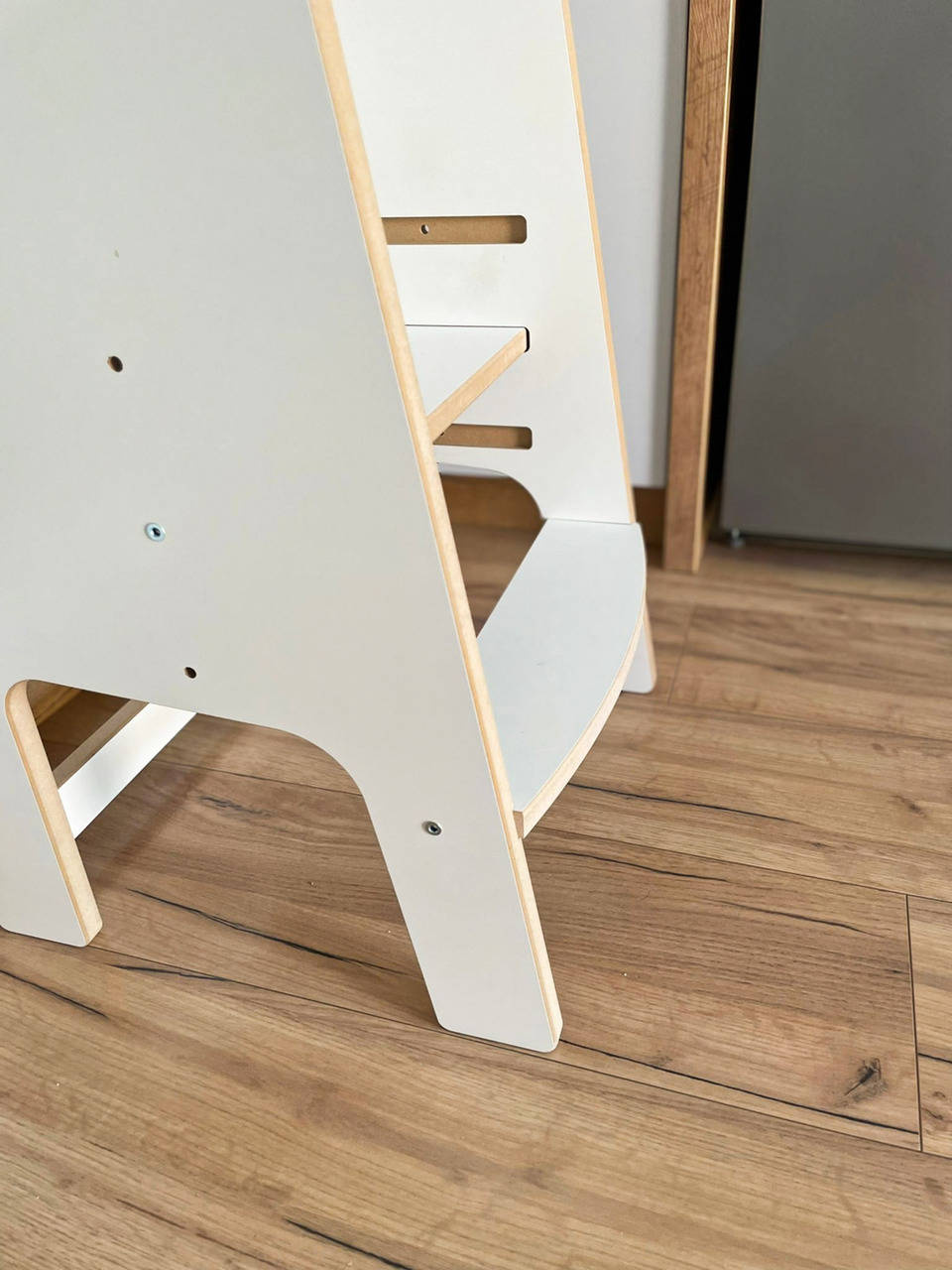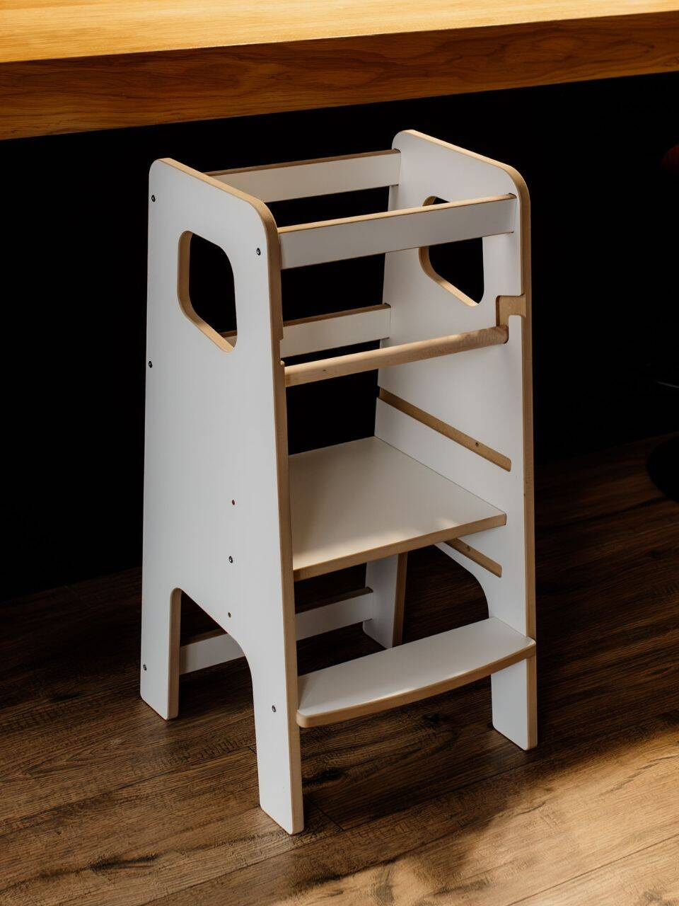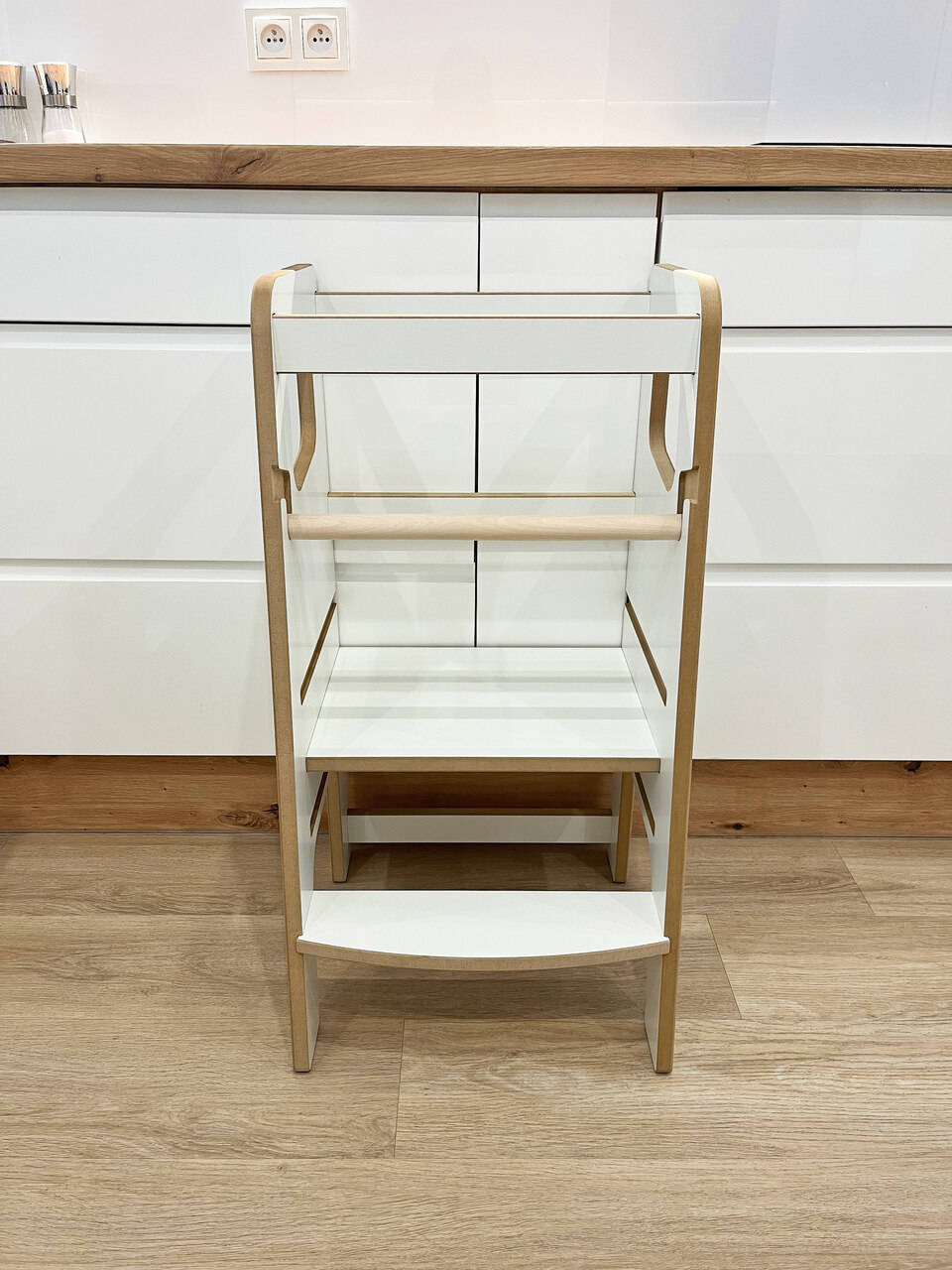 Nasz pomocnik kuchenny został zaprojektowany z myślą o wygodzie rodziców. Bardzo prosty montaż zajmuje jedynie około 5 minut, a w zestawie znajdziesz komplet wysokiej jakości wkrętów, praktyczny kluczyk montażowy oraz estetyczne zaślepki maskujące elementy złączne. Dzięki przejrzystej instrukcji i przemyślanemu systemowi połączeń, składanie pomocnika jest intuicyjne i przyjemne.
