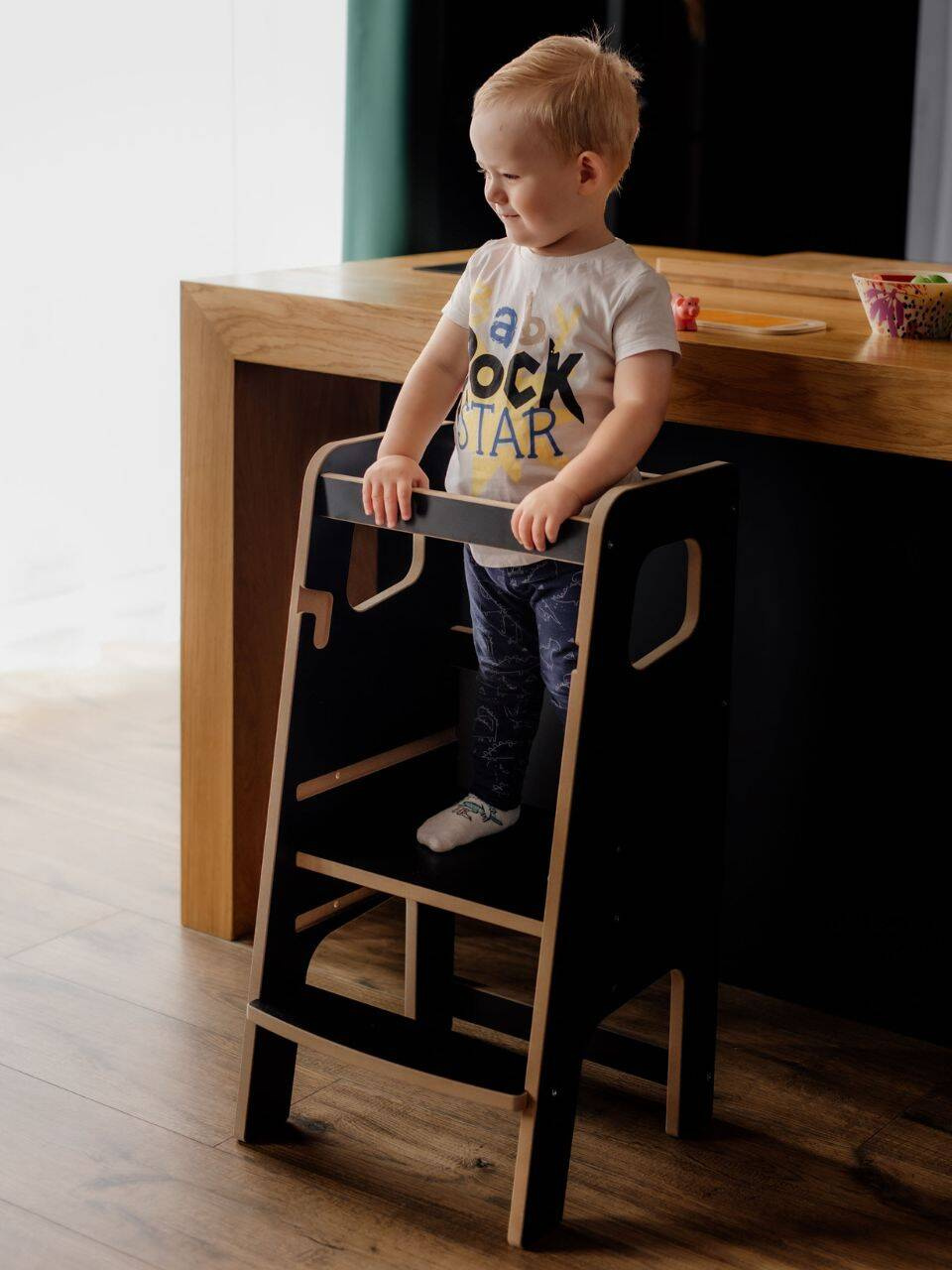Pomocnik wyposażony został w specjalne zabezpieczenia, które skutecznie chronią przed przypadkowym wypadnięciem mniejszego dziecka. Wysokie barierki ochronne otaczają podest z każdej strony, tworząc bezpieczną przestrzeń, w której dziecko może swobodnie poruszać się i skupić na kulinarnych odkryciach.