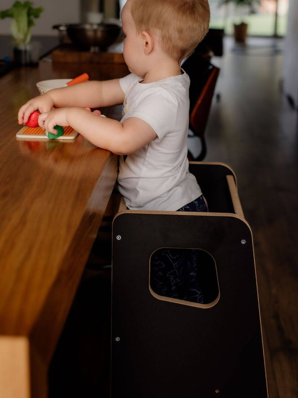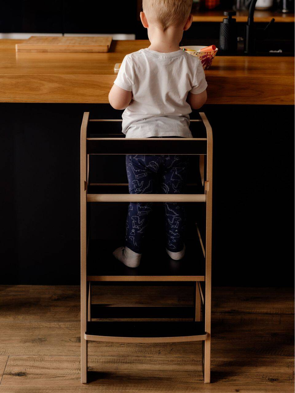 Regulowany pomocnik kuchenny dedykowany jest dzieciom w wieku od 12 miesięcy do 7 lat, które potrafią samodzielnie stać i wykazują zainteresowanie czynnościami kulinarnymi. Dzięki trzem poziomom regulacji, produkt idealnie dopasowuje się do wzrostu dziecka, towarzysząc mu przez długie lata rozwoju.